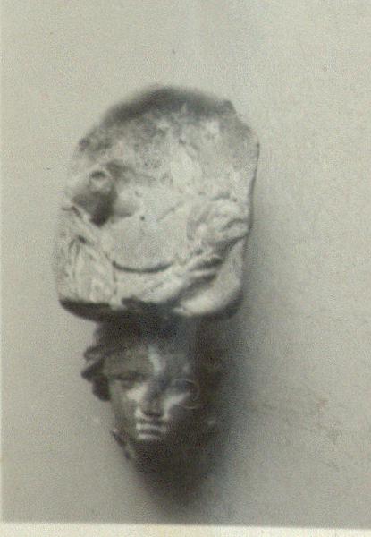 | Description: | Head of woman carrying a basket with offerings. Broken off at the base of the neck. Her hair is parted in the middle from the crown to nape of neck, with a lock falling at either side of the neck. The liknon (?) or basket is supported on a pad, and contains offerings which resemble fruit. Traces of white paint on the face, red on the hair and pad. Pierced in small hole beneath. Pinkish buff clay. ADENDA: Offerings: cake, fruits, wreath. Color: white slip. Pink on face, dark red on hair and pad, orange red on basket, and offerings. Dress probably pale blue (traces at base of neck). | |
