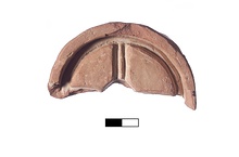 | Description: | Mold broken in half. Impressions for upper half of outer ring and one complete spoke preserved. Reddish pink clay. Mold for T 4370. | |
