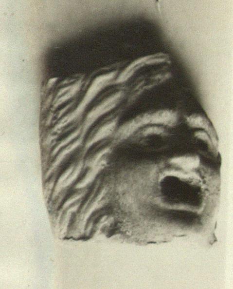 | Description: | The face, and the hair on the right side, and the finished lower edge of a tragic mask preserved. Mostly open behind: the plain back turns in sharply where it joins the moulded hair, and then out again, at right angles. Eyes and mouth pierced. Red color on the face. Pale yellow buff clay. | |