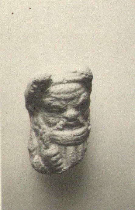 | Description: | First interpretation: Satyr playing the flutes. The face, the forehair and the hair immediately beside the face, the right hand holding the flutes and the top of the flutes themshelvees are preserved. Blunt horns over the temples. Crude work. Traces of red paint. Yellow slip. Light reddish clay. ADDENDA, 1955: Silen drinking from kantharos, fillet and ivy flowers in his hair. The right hand holding the kantharos, the top of kantharos is preserved. Also traces of white and blue paint. Cf. T 380, possibly same mold but different retouching. | |