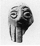 | Description: | Only the crown of the head, the upper part of the face and the right side of the beard preserved. A very crudely gouged head with round crown, staring eyes, elementary mouth and beard indicated by parallel vertical strokes. Thin walls. Unpainted. Buff clay. | |