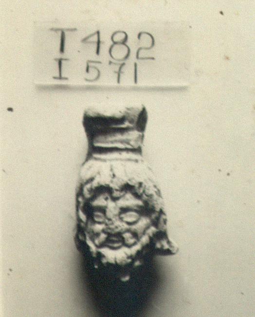 Hollow, mould-made in two halves, badly joined. Traces of orange red paint on the face.