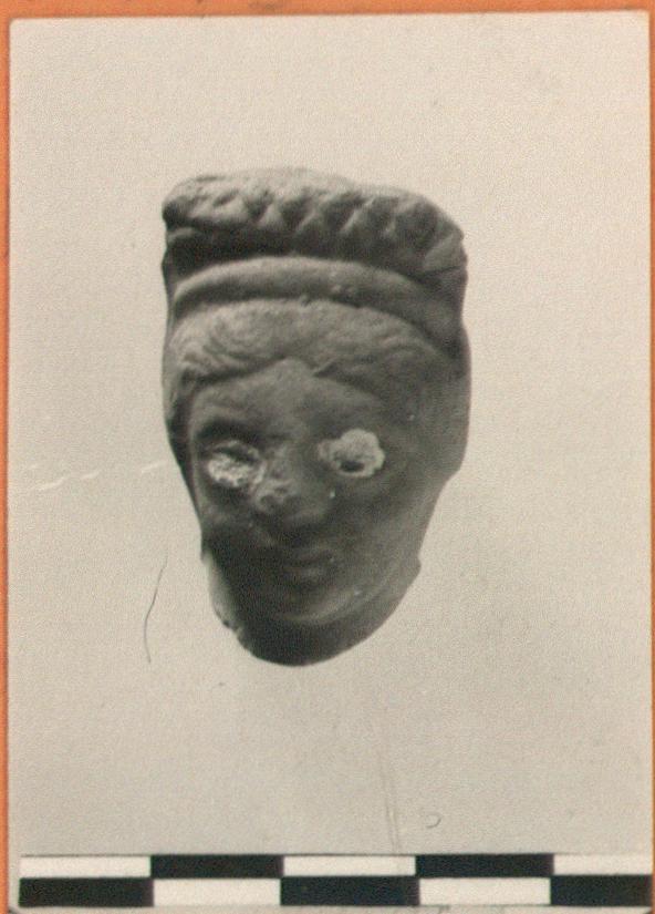 | Description: | Front part of head. Broken at neck and back. The face is full, with a double chin. The eyes are large, the nose straight, the mouth short with full lips. The hair is parted in the center and drawn down in waves over the ears. Front the top of the headdress-perhaps simply the hair piled high in a braid. More careful work than in the larger examples of similar aspect. Mold made; hollow. Red wash over the face, with large white daubs on the eyes; traces of black on the hair. Buff clay. Publication: 4th c. A.D. | |