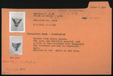 | Description: | Boukranion mask. Mended from three pieces. The eyes and nostrils pierced, and a hole in the forehead (for hanging ?). The forehead incised to represent hair. Remains of red color on the face. | |