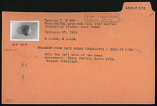 | Description: | Only the left side of the head of the cock preserved. Couged technique. Heavy fabric, burnt gray. Late Roman. | |