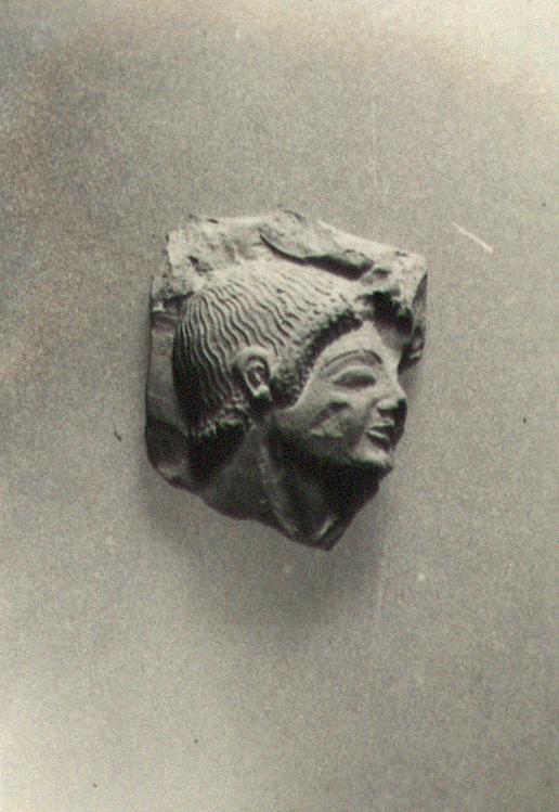 | Description: | The edges broken; the back original, with a very slight curve in both directions. Head of youth in relief, right. The hair is indicated by fine wavy ridges radiating from the top of the head, and ending in a heavy roll round face and neck, covered with small dots of clay. The ear high, modelled over the hair; the eye full front. Above the head, at the front, some object; possibly a raised arm. Fine pinkish clay. | |