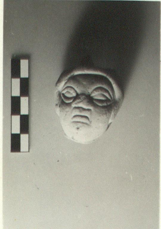 | Description: | Broken away in back, above and below. Squat face with double chin. Unglazed. Buff clay. | |