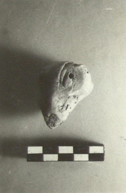 | Description: | Head of animal. Broken off at neck; much battered; only stumps of ears remain. The nose is broken away. The eyes are indicated by unsymetrical piercings, the eye brows which meet at the nose are incised. The mouth is an irregular slash. Seems to be the head of a very clumsily modelled dog (?) or cat. Coarse brown clay. | |