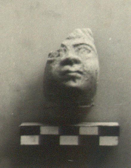 | Description: | Broken away above and at neck. A bit of the hair preserved at top. The face painted red with traces of added white. Pinkish micaceous clay. Late Roman. ADDENDA: Same mold as T 854. | |