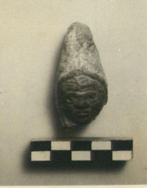 | Description: | First interpretation: head of woman. Broken away behind and at neck. A boy wearing a high-pointed headdress (?). Holes for eyes. Hole for suspension through headdress. Thick white color on headdress. Dull red glaze inside and out. Possibly from a plastic lamp. Late Roman. | |
