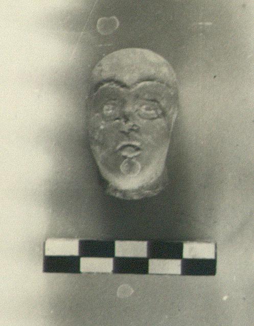 | Description: | Broken away behind and at neck. Nose damaged. Shaved head. Grooves for eyebrows. Traces of white in eyes. Red glaze, mostly flaked off. Micaceous buff clay. | |