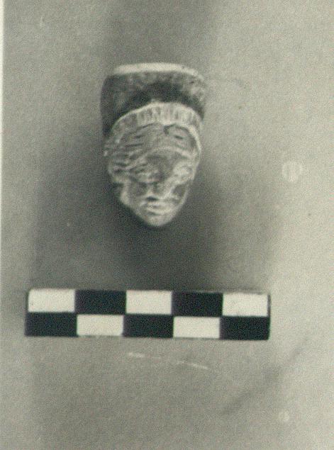 | Description: | Broken behind and at neck. Head of woman with high headdress. Traces of red paint on flesh. White on band between hair and headdress, and in eyes. Pinkish buff micaceous clay. | |