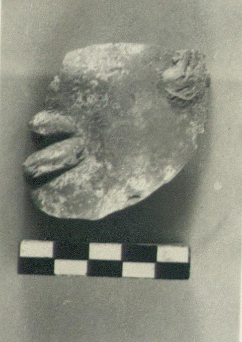 | Description: | Part of left cheek, half the mouth and a wisp of hair of a mask about half life size. Part of a hole for attachment at right. Traces of red on white paint. Micaceous buff clay. | |