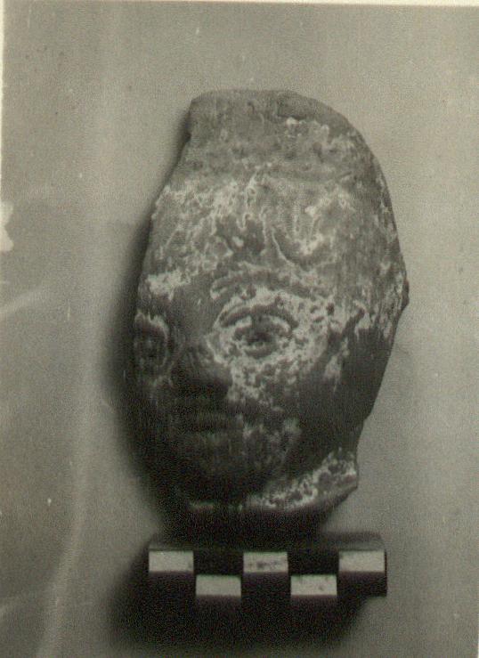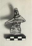 | Description: | From a throned figure such as T 762. Broken off below hips, and at left elbow. The head is knoblike, crowned with crude plastic hair. Bands across body; zigzags across chest and back of arms. Red glaze. Gray clay. | |