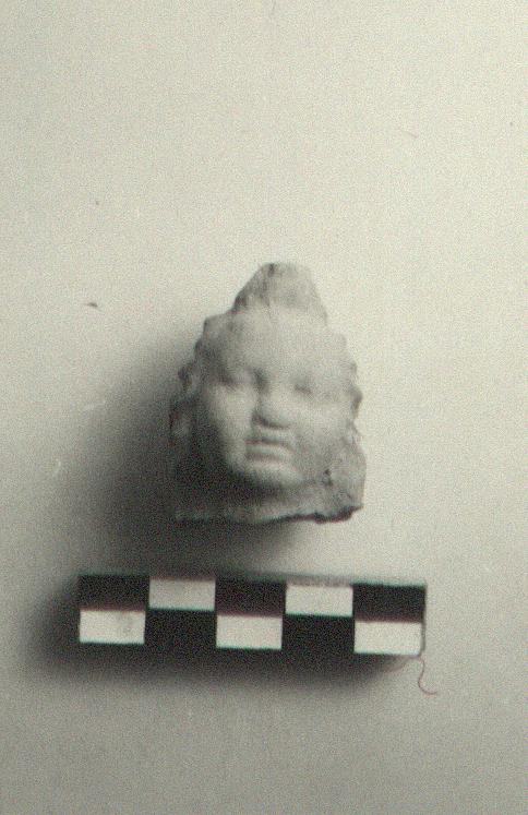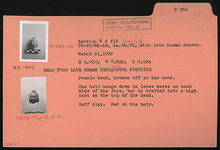 | Description: | Broken off at the neck. The hair hangs down in loose waves on each side of the face, but is braided into a high knot on the top of the head. Red paint on the hair. Buff clay. Late Roman. | |
