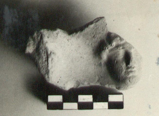 | Description: | That is part of a twin female head, which is preserved at the left edge. Similar to T 785, in shape and treatment. But somewhat smaller and double. The neck is not modelled. Now joined to the right of T 786. There are neatly finished holes, between each pair of heads, at the level of the neck. Moulded. Unglazed. Fine highly micaceous brownish-buff clay; with grayish core. | |