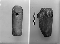 | Description: | Crude representation of woman with baby in arms. Back and left side preserved, from neck down. Its rounded flattened head on which air and features are drawn interrupts the flow of folds and features gougings. Folds continued all round top part of back, as if a shawl is represented. Just under this at back, large vent hole, under which is the signature: K Y. Remains of heavy white slip on garment. Clay coarse pink. <graphic> | |