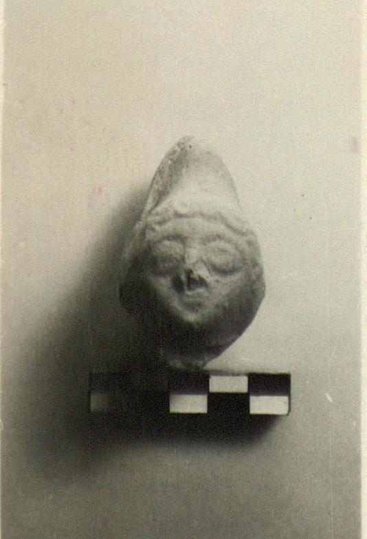 | Description: | Preserved is only the head of a figure, wearing a high conical headdress. Moulded. Traces of red paint over white on the headdress. Buff micaceous clay. Late Roman. ADDENDA: Same mold as T 1145. | |