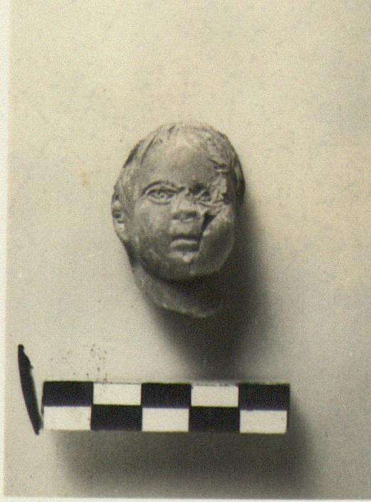 | Description: | Head of child. Broken off behind at the join. The hair straight and incised. A little of the wash shows on the joint surface. Dull red wash. Red somewhat micaceous clay. | |