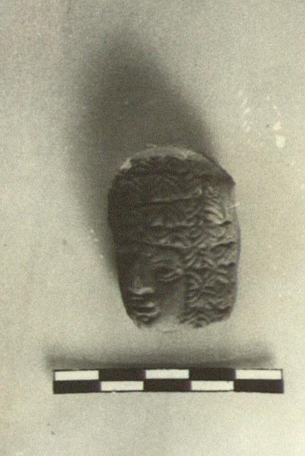| Description: | First interpretation: head of figurine. The figure wears a high ornamental headdress. Pierced eyes. The curiously distored mouth suggests a mask of some sort. Buff clay, thin purple red wash. | |