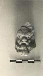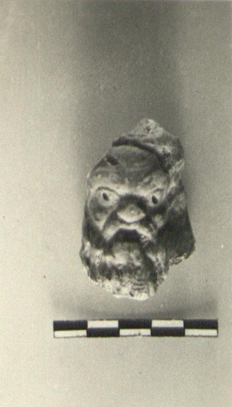 | Description: | Head with beard and moustache; the eyes pierced. Red paint. Yellow-red clay. From a plastic lamp (?) | |