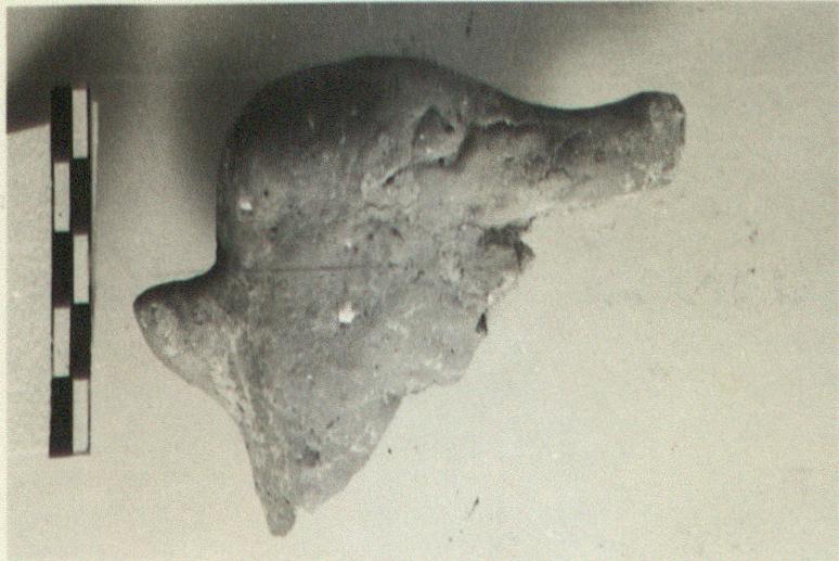| Description: | Head of duck figurine. The lower bill is missing, the head broken away below. At the back of the head is a small projection, pierced with a hole for suspension. Purplish red glaze wash. Red clay with bits. From a lamp (?) | |