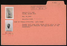| Description: | Egg-pattern headdress. Deeply gouged features. Thick white paint in the features and headdress. Orange buff clay. Late Roman. | |