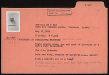 | Description: | Right cheek, nose, eye and part of forehead of a man 's face preserved. The eyes pierced. Remains of purplish brown paint (?) Dark red clay. From a plastic pot or lamp (?) ADDENDA: Probably woman 's face from a double-head plastic lamp. From a lamp at any rate (C. Grandjouan). | |
