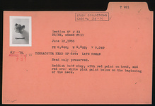 | Description: | Head of dog only preserved. Red paint on head, and red over white, pink paint below on the beginning of the neck. Late Roman. | |