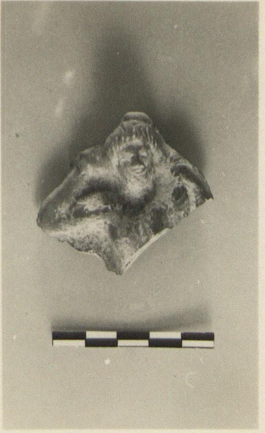 | Description: | Head and shoulder of a woman binding a fillet (?). Broken all around, but the edge of the mold preserved at the top and left. Remains of yellow paint over white. Purple red clay. Perhaps not a relief, cf. T 1009. | |