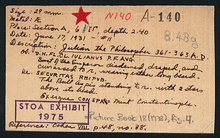 | References: | Publication: AgoraPicBk 18 (1978) Image: 2017.13.0001 Notebook: Α-1 Notebook Page: Α-1-75 (pp. 135-136) Card: Α-140 Card: Α-140 |
