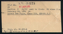 | References: | Publication: Agora XXVI Publication Page: Agora 26, s. 133, p. 107 Publication Page: Agora 26, s. 367, p. 341 Image: 2012.75.0782 (85-44-27) Notebook: Κ-2 Notebook Page: Κ-2-20 (pp. 220-221) Notebook Page: Κ-2-24 (pp. 228-229) Card: Κ-125 |