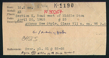 | References: | Publication: Agora XXVI Publication Page: Agora 26, s. 125, p. 99 Publication Page: Agora 26, s. 367, p. 341 Image: 2012.77.0793 (90-14-7) Notebook: Κ-10 Notebook Page: Κ-10-34 (pp. 1858-1859) Notebook Page: Κ-10-65 (pp. 1920-1921) Card: Κ-1190 |