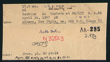 | References: | Publication: Agora XXVI Publication Page: Agora 26, s. 129, p. 103 Publication Page: Agora 26, s. 368, p. 342 Image: 2004.05.0292 (82-56-21) Image: 2012.73.1556 (82-56-21) Deposit: D 4:1 Deposit: D 4:1.2 Notebook: ΛΛ-4 Notebook: ΛΛ-5 Notebook Page: ΛΛ-4-102 (pp. 793-794) Notebook Page: ΛΛ-5-28 (pp. 846-847) Card: ΛΛ-285 Card: ΛΛ-285 |