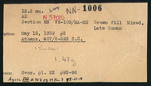 | References: | Publication: Agora XXVI Publication Page: Agora 26, s. 65, p. 39 Publication Page: Agora 26, s. 369, p. 343 Image: 2012.75.0062 (85-21-16) Notebook: ΝΝ-8 Notebook Page: ΝΝ-8-37 (pp. 1462-1463) Notebook Page: ΝΝ-8-38 (pp. 1464-1465) Card: ΝΝ-1006 |