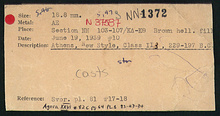| References: | Publication: Agora XXVI Publication Page: Agora 26, s. 90, p. 64 Publication Page: Agora 26, s. 369, p. 343 Image: 2004.05.0166 (82-43-34) Image: 2012.73.1179 (82-43-34) Image: 2012.75.0144 (85-23-26) Card: ΝΝ-1372 |