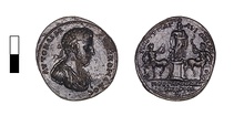 Bust of Commodus r., laureate, cuirassed, draped. Border of dots.