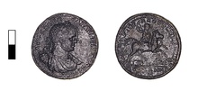 Mounted emperor r., spearing fallen enemy. Border of dots.