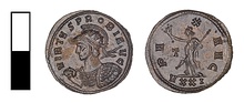 | Obverse: | VIRTVS PROBI A-VG Bust of Emperor l., radiate, helmeted and cuirassed, holding spear and shield. Border of dots. | |