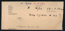 | References: | Publication: Agora IX Lot: Η 9 Notebook: Η-4 Notebook: Η-6 Notebook Pages (4) Card: Η-3264 |