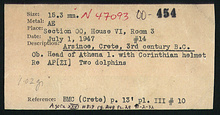 | References: | Publication: Agora XXVI Publication Page: Agora 26, s. 274, p. 248 Publication Page: Agora 26, s. 371, p. 345 Image: 2012.77.1665 (91-2-32) Image: 2012.75.0249 (85-26-22) Notebook: ΟΟ-4 Notebook Page: ΟΟ-4-57 (pp. 704-705) Card: ΟΟ-454 |