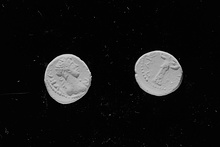 | Reverse: | λAK[- - - -] Athena stg. r., wearing peplos with archaistic overfolds, holding shield in l. and brandishing spear in upraised r.; border of dots. | |