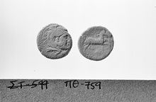 | Description: | Cop 1214--1221 Ob. Head of young Herakles right, in lion's skin. Re. B A above. naked youth on horse stepping right, with right foreleg and left hind leg raised. Below N to right Γ. | |