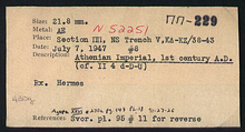 | References: | Publication: Agora XXVI Publication Page: Agora 26, s. 169, p. 143 Publication Page: Agora 26, s. 372, p. 346 Image: 2012.78.0467 (91-27-26) Card: ΠΠ-229 |
