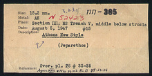 | References: | Publication: Agora XXVI Publication Page: Agora 26, s. 128, p. 102 Publication Page: Agora 26, s. 373, p. 347 Image: 2012.75.0141 (85-23-23) Image: 2012.75.0142 (85-23-24) Card: ΠΠ-385 |