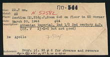 | References: | Publication: Agora XXVI Publication Page: Agora 26, s. 183, p. 157 Publication Page: Agora 26, s. 373, p. 347 Image: 2012.78.0496 (91-28-20) Card: ΠΠ-544 |