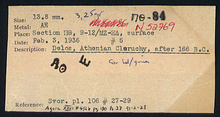 | References: | Publication: Agora XXVI Publication Page: Agora 26, s. 206, p. 180 Publication Page: Agora 26, s. 372, p. 346 Image: 2012.77.1661 (91-2-28) Image: 2012.74.1954 (85-18-19) Card: ΠΘ-84 |