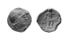 | Reverse: | Α/Ε-Θ Zeus, nude, standing r., holding thunderbolt in lowered r. hand, extending l. arm; at r., prow. | |
