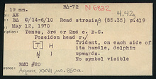 | References: | Publication: Agora XXVI Publication Page: Agora 26, s. 280, p. 254 Publication Page: Agora 26, s. 362, p. 336 Lot: ΒΔ 10 Card: ΒΔ-72 |