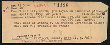 | References: | Publication: Agora XXVI Publication Page: Agora 26, s. 85, p. 59 Publication Page: Agora 26, s. 375, p. 349 Deposit: M-N 15:1 Card: Τ-1196 |